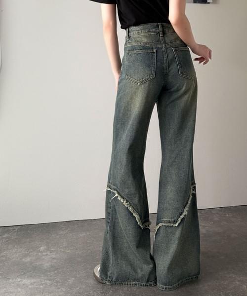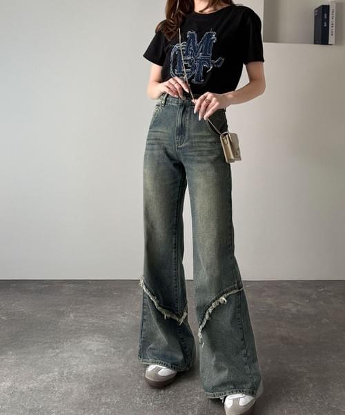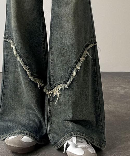 LCSS2637 顯腳長斜紋流蘇設計復古牛仔喇叭褲