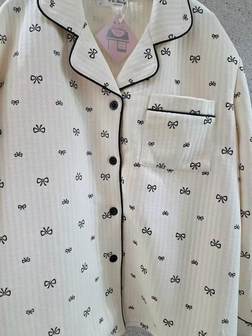 PJ01 暗條紋米白蝴蝶結睡衣